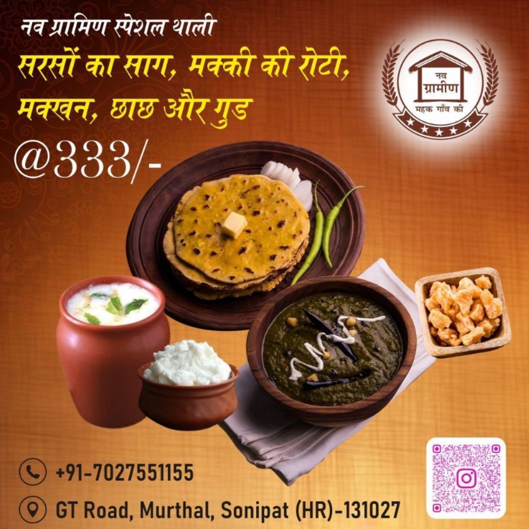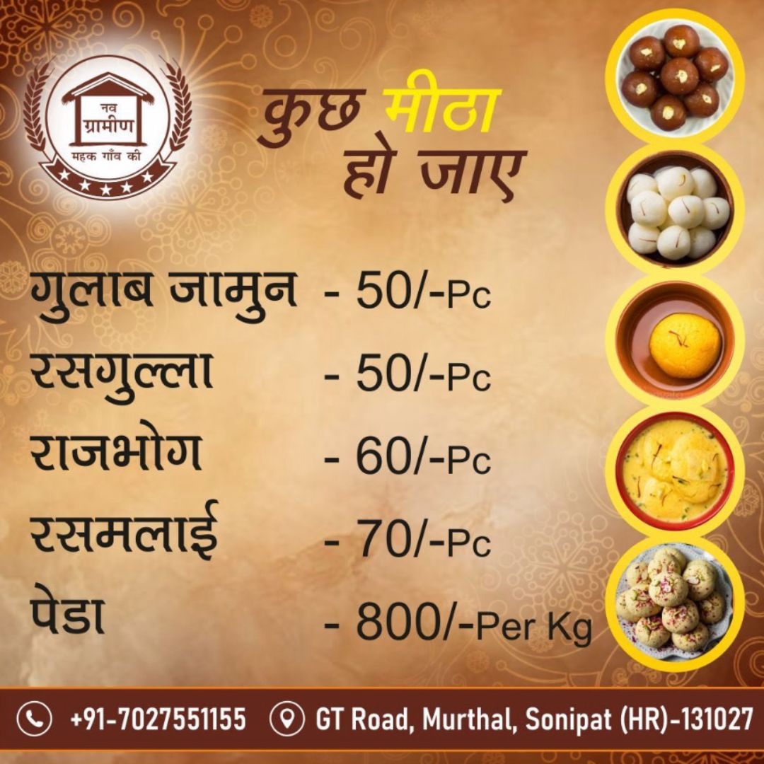 Menu. Roti – Nutrition Guide Ragi RotiCalories: 236, Protein: 6.5, Carbs: 42 Bajra RotiCalories: 361, Protein: 11.9, Carbs: 66.8 Jowar RotiCalories: 348, Protein: 10.7, Carbs: 72.9 Roti – Nutrition Guide Besan RotiCalories: 300, Protein: 7.9, Carbs: 46.1 Sattu RotiCalories: 300, Protein: 10, Carbs: 38 Wheat RotiCalories: 385, Protein: 22.4, Carbs: 62.7 Dhaba Special – Sweets Rasgulla/Gulab JamunRoasted eggplant spread, marinated tomatoes with garlic & fresh basil 850/- per piece RajbhogRoasted eggplant spread, marinated tomatoes with garlic & fresh basil 860/- per piece PedaRoasted eggplant spread, marinated tomatoes with garlic & fresh basil 8800/- per kg RasmalaiRoasted eggplant spread, marinated tomatoes with garlic & fresh basil 870/- per piece Special Chai Thali Combo @99/- Only Tea + Chilla Tea + 2 Biscuit + Bunn Maska Tea + Veg. Maggie Tea + Prantha’s Tea + Mix Pakoda + Biscuits Whole Grain Pasta More Items